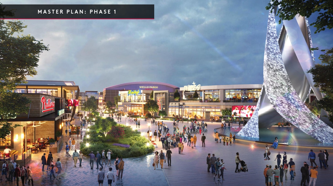 Note that the six images say “phase 1.” They plan to do this thing in two parts, and phase 1 includes upgrades to Xfinity Live, a 5,000 seat concert venue, a hotel, new retail and restaurants, and an outdoor plaza. They aim to finish the Xfinity upgrades in 2025 or early 2026, and then concert venue, retail, restaurants, and hotel are slated for 2028.
