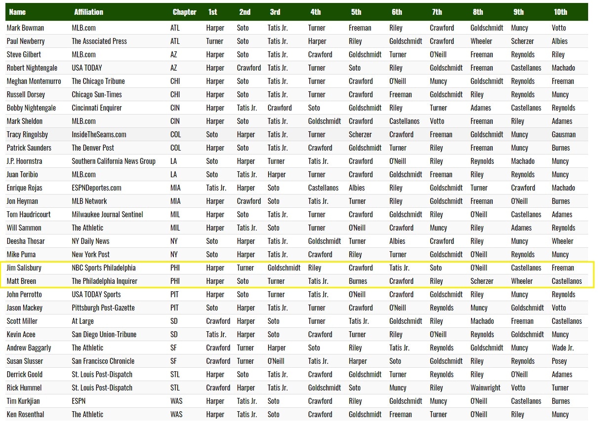 And nobody will argue that interpretations of the word “value” are going to be different. These awards are subjective in nature, and ambiguously defined, but when 29 other writers propel Soto to a 2nd place finish when Jim had him 7th, then he is the extreme outlier, and looks contrarian in that regard. Bottom line, if “winning” was uber-important, then Harper would have dropped below his 2nd/3rd/4th guys on that ballot, because the Phillies didn’t go to the postseason, Harper had 0 hits in that crucial Atlanta series, and 82-80 is hardly impressive.